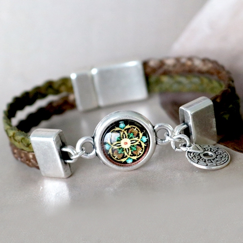 This mega trendy jewellery design can be made with our marvelous basic mandala cabochons in 12 and 20mm. We mixed these fun cabo's with Cuoio, wooden beads, facet, flat DQ leather and braided DQ leather. Our marvelous settings for 12mm and 20mm cabochons are just the perfect to add the mandala cabochons to your design. Mix dark brown shades with the happy designs of the mandala cabochons and create a stylish boho look!