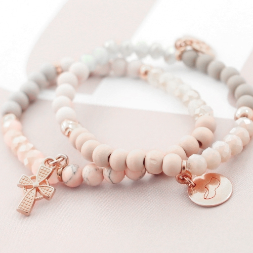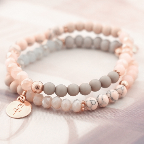 This fun jewellery makes you blush, look at the beautiful pink colour! These faceted beads give you a fresh bling look. Feminine and chique! Create this beautiful key chain by using the 23mm DQ clasp and the DQ metal ornament pendant. Use Rose Gold coloured DQ metal findings, beads and charms for a pinky glow. The grey accents form a beautiful contrast next to the pink colours. bring in the sping fever!