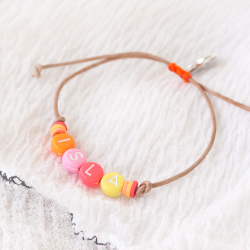 This cheerful jewellery set makes many girls’ heart skip a beat. The colourful letter beads in this jewellery set makes it even more special! The necklaces, made with wooden beads and letter beads are finished with cute fimo ice cream charms. To make these necklaces we used wooden beads, Katsuki beads, faceted beads, DQ European leather and elastic wire. To make the matching bracelets we used the exact same materials + some extra coloured elastic cord. We wrote a few names and summery words with the letter beads! Amazing, isn’t it?