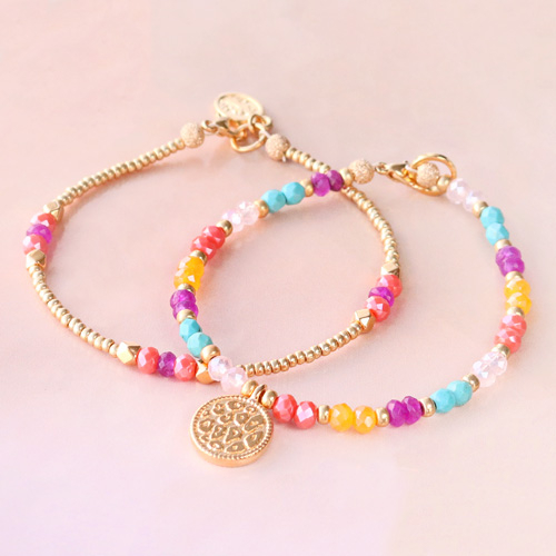 Bracelets with faceted beads are always a good addition to your jewellery collection. But these bracelets are a little bit more special! The colourful beads really add a cheerful element to the bracelets combined with glass pearls and crystal glass. We used Designer Quality European metal to finish off the bracelets and to make them look extra fancy. You can use lots of different stringing materials when making these bracelets, like metal wire, macramé bead cord or belcher chain!