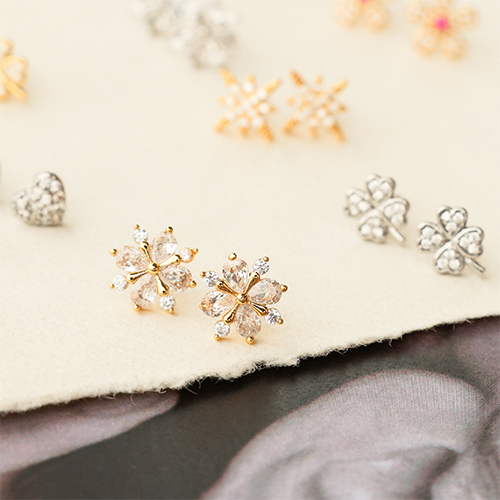 Brass TQ metal earrings / earpins zirconia flower Gold