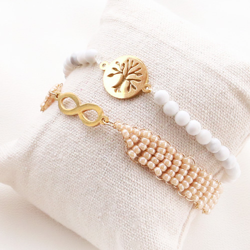 In this jewellery set made from stainless steel we’ve used belcher chain to create layered necklaces. It’s always better to use stainless steel findings so your jewellery will last for a long time! Go for a summer look with coloured elastic cord and Miyuki beads. A bracelet with coloured elastic cord is easily made! Attach more than one charm on to the necklaces. It gives a playful effect and it’s made to last forever!