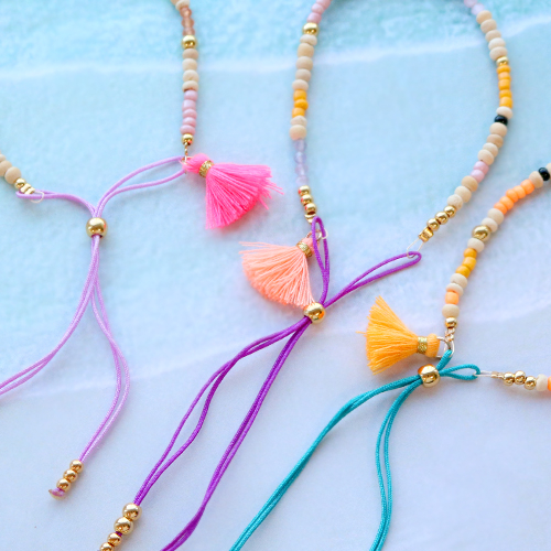 Do you also want to make cheerful bracelets? Then get started with the new colourful tassels. With these fun items, you give every piece of jewellery a playful look. Create summer bracelets or anklets by designing several patterns. Use various beads for your design, such as coconut beads, glass seed beads, acrylic beads and Cat’s Eye faceted beads. Thread the beads and the tassels on a metal wire and make a little eye on both sides. Then loop a fun colour of macramé bead cord through the metal wire eye. Place a DQ European metal macramé clasp over the wire. Thread multiple beads onto the ends of the macramé bead cords for the finishing touch. Now it's your turn to make trendy summer jewellery!