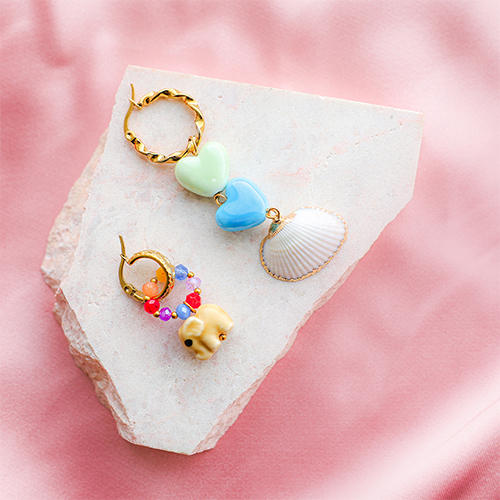 Discover our new cheerful collection of ceramic beads. Available in colourful shapes like elephant, turtle, mushroom, heart, and shell. Combine the beads with facet, trendy cord, millefiori, and natural shell charms for beautiful necklaces and cheerful earrings.
