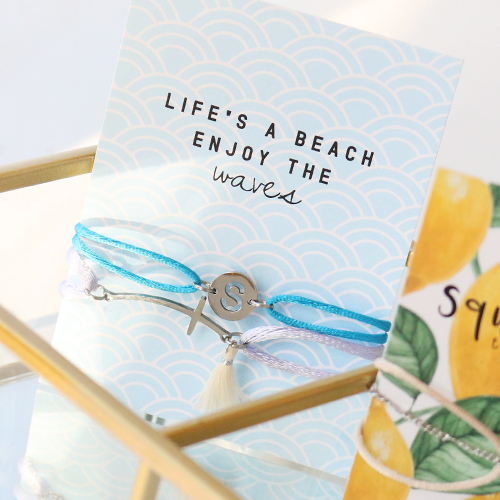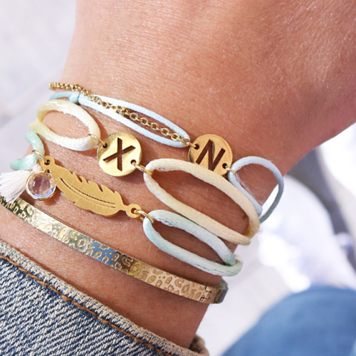 Initial bracelets made with satin wire, super easy and it looks great too! What do you need? Choose the colours of the satin wire and the initials you want to work with. Cut enough wire and attach a jump ring on both sides of the charm. Pass the wire through both rings and determine the right length. Finally, make a sliding knot on each side, and your trendy bracelet is ready! Of course you can also choose another nice stainless steel charm to use. Good luck!