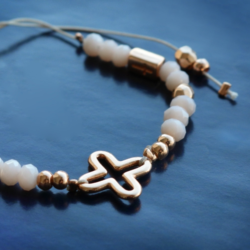This jewellery set is super girly! The minimalstic bracelets have a trendy ethnic look. The combination of the DQ metal beads in rose gold with soft pink and beige gives this set a luxurious look. We chose little beads and different sizes of macramé string on purpose in this set to create a cool set. Because the bracelets are so little you wear them together around your wrist. We also love the DQ metal ring! You can glue flat leather into it, in this set we choose for Crystal glitter tape. This matches the little bracelets perfect. Do you like to know how the macramé bead clasp works? Take a look at our DIY video. Here we show you step by step how we use the macrame bead clasp in our piece of jewellery.