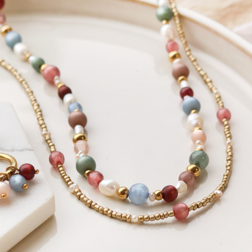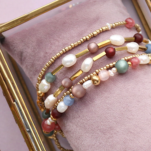 If you like to create stylish jewellery in warm fall colours, then this new series Polaris Elements beads is made for you! The super Polaris mosso and super Polaris matt are available in 6 mm and 8 mm and have a beautiful glow. Make necklaces by combining them with golden beads, hematite tube beads and freshwater beads for an elegant look. Use a headpin with a ball to create charm and fix them to a golden stainless steel earring.