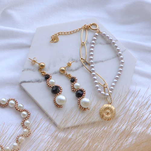 Are you also fond of glass pearls? Make a magnificent bracelet by stringing a beautiful big bead onto an eyepin and by creating a second eye on the other side. Create several of these connectors that you connect with jump rings. Attach smaller beads that you transformed into a charm using a headpin, onto the jump rings. Or create earrings with glass pearls in four different sizes, Miyuki beading wire and glass seed beads. You can use the same pattern to create a bracelet or a necklace by using glass pearls in one and the same size.
