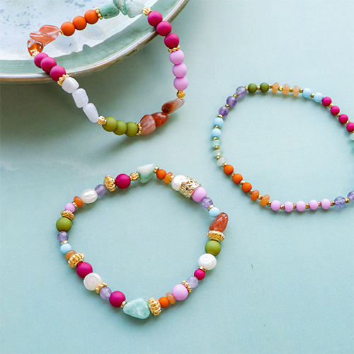 Create beautiful bracelets and a trendy phone cord with these acrylic beads in warm autumn colours. Use elastic cord for the bracelets and alternate the acrylic beads with, for example, natural stone beads, DQ metal beads, acrylic tube beads, faceted hematite beads and freshwater pearls. Design a phone cord with macramé cord and DQ metal beads. Finish the telephone cord with coloured key rings in the same shade as the acrylic beads
