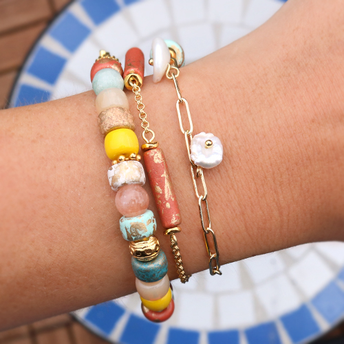 By using freshwater pearls and a ceramic tube bead in the middle, you can create an elegant necklace. A beautiful clasp with or without an extension chain and the necklace is finished. Make trendy bracelets and earrings by combining ceramic beads with glass beads, freshwater pearls and DQ metal beads. Use headpins and round nose pliers to create original earrings.