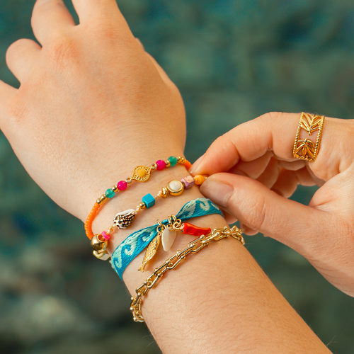 Colour, colour and again colour! That is what this trend is all about. The more colours and materials you combine, the better it will be. Create bracelets and necklaces with different kinds of beads such as acrylic beads, natural stone beads, ceramic beads and millefiori beads. Create matching earrings by stringing the same beads onto earrings creole. Colourful ready-to-wear rings can be worn with homemade rings of elastic cord and glass seed beads for a fantastic look!