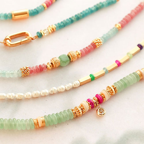 These natural stone beads in beautiful spring colours can be beautifully combined with various DQ metal beads from the collection. Design bracelets in which you alternate natural stone beads with freshwater pearls and zirconia beads, for example. Close the bracelet with a clasp and an extension chain. If you are using large tube beads, it is a good idea to thread this bead with a large hole over a smaller bead so that the tube bead stays in place.