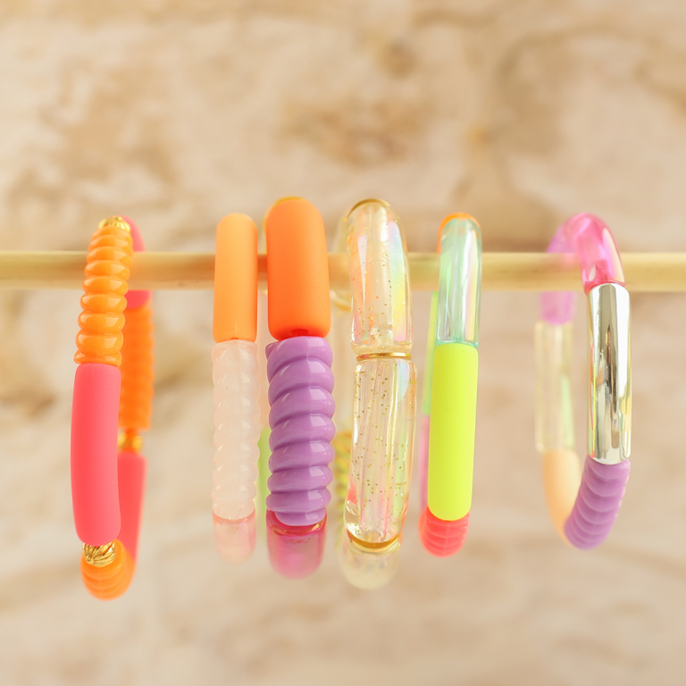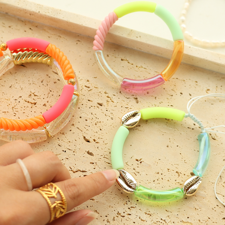 This new series of acrylic tube beads matt summer and AB coating is perfect for designing colourful bracelets. Thread the bracelets on elastic thread or macramé thread and combine with, for example, cowrie shells for a beautiful summer look!