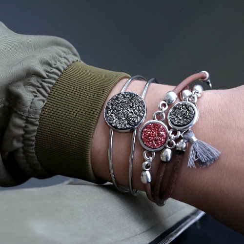 Make a glamorous look and use round DQ leather and shiny flat 12mm Polaris Elements Goldstein cabochons. Use gorgeous DQ metal findings and settings like our handy end caps and give your piece of jewellery a professional finish. Use trendy beads in bright colours. Also create a nice present by adding a Polaris Elements Goldstein cabochon to a bracelet with a setting for 20mm cabochon. For all your jewellery gifts we also offer you a lot of nice gift wraps, like these cute organza jewellery bags!