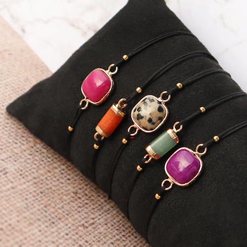 Looking for inspiration for your new collection? Be sure to take a look at this jewellery inspiration with natural stone! This time we started working with the beautiful new natural stone charms and connectors. With these top items you can create stylish jewellery such as earrings in no time. You can choose to let the natural stone charm shine and simply attach a charm to an earring finding. Do you like eye-catching earrings? Then be sure to try combining a natural stone connector with a natural stone charm or a bohemian charm. You can do this by hanging them underneath each other. Because of the beautiful shades it becomes one set but you get a playful and unique effect. Do you want to make matching bracelets? Then use macramé bead cord to knot a bracelet with a natural stone connector in the middle. Good luck!