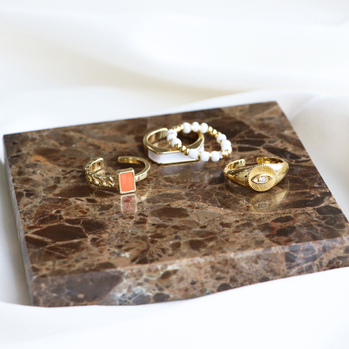 These golden and silver brass metal rings with enamel are super nice to wear together with homemade rings. Design your own ring by combining for example rocailles beads, faceted beads and DQ metal beads. Use nylon or elastic cord and finish the ring with a knot and a drop of jewellery glue. Work with a bead mat when using small beads.