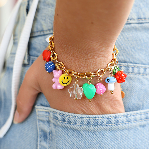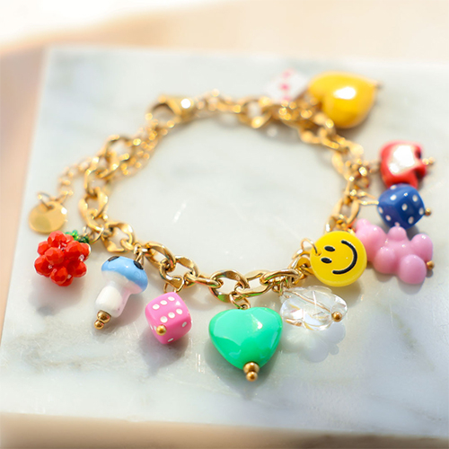 With the latest dice and heart acrylic beads, you can create the cutest jewellery. The beads are available in various colours. Combine these acrylic beads with the popular mushrooms, smileys, and fruits for a playful look. Create a charm bracelet or thread a necklace with different beads.