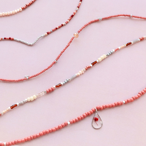 Looking for jewellery inspiration in trendy colours for next winter season? In this inspirational set we created necklaces and chokers with glass seed beads and nylon cord or metal wire. You can alternate the glass seed beads with for instance cube beads or freshwater pearls or you can string a necklace and fix a beautiful charm with dried flowers on it. Design a clasp with artistic wire by bending the wire on one side into a ring and on the other side into a hook. Fix a jump ring to the other side of the necklace and your clasp is ready!