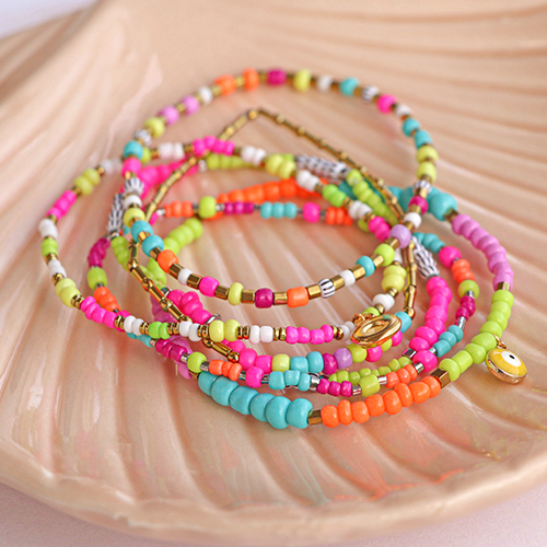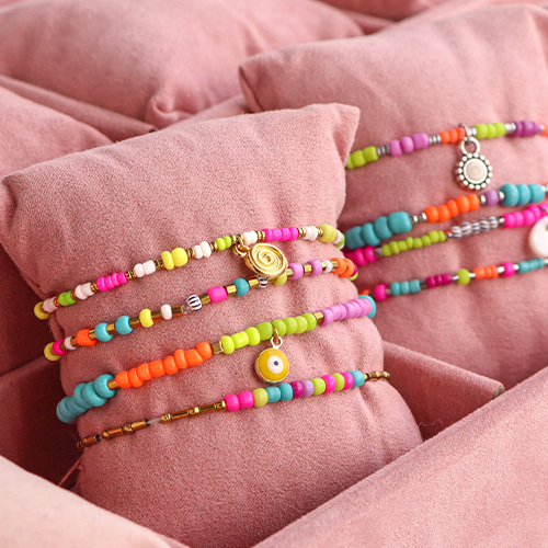 This series of glass seed beads is very popular thanks to the beautiful neon colours; this summer’s big trend! You can create fantastic bracelets using elastic cord and jewellery glue. Use glass seed beads in different sizes and combine those with hematite beads to create a fun necklace. To create sunglasses cords, you can use macramé bead cord. String beads onto 1 macramé cord, then twist several cords until reaching the required length.