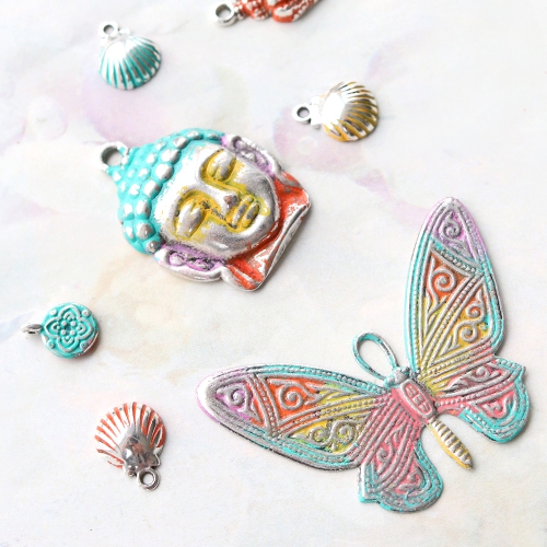 With the latest ImpressArt arrivals you can personalise the most cheerful jewellery and colour your ImpressArt print with new Vintaj Patina. You can also use Vintaj Patina in combination with other metal, like DQ European metal and TQ metal beads and charms. Combine the metal with pompoms, tassels and DQ European leather in summer colours! Add Vintaj Patina to your metal with a small tassel.