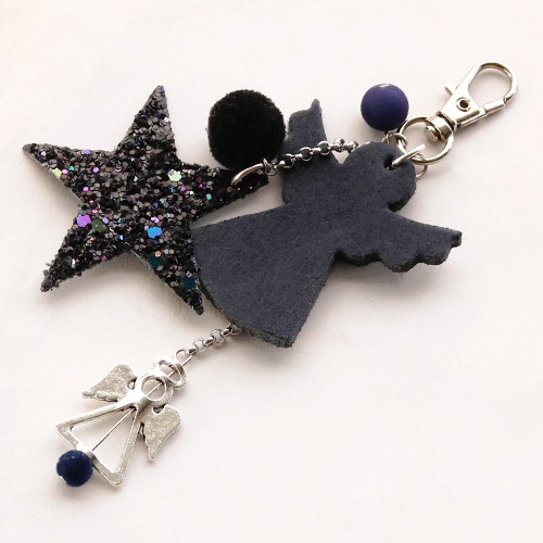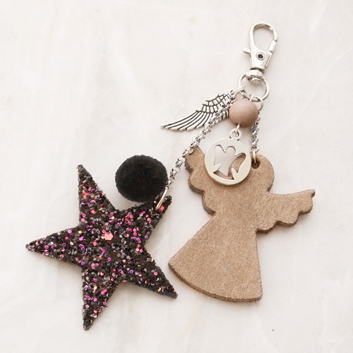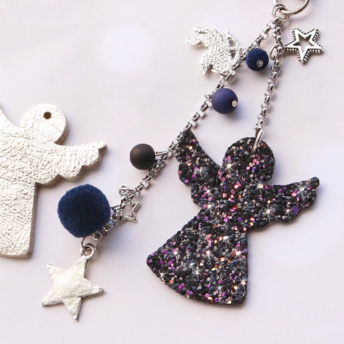 These keychains are eyecatchers, because of the Designer Quality leather and faux leather pendants. The shiny details of the glitter angels and stars are just perfect, combined with the metal charms. The dark-coloured pompom charms make the whole piece more chic. Attach all charms and pendants on belcher chain in different heights to create a playful effect.