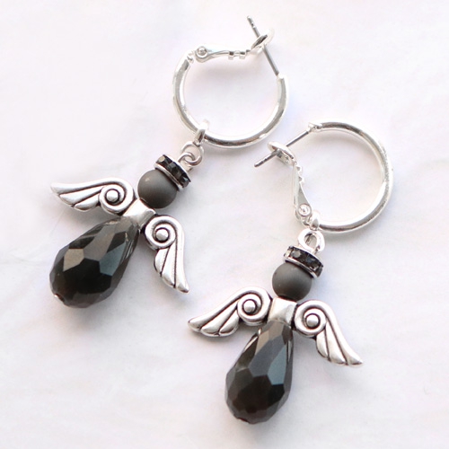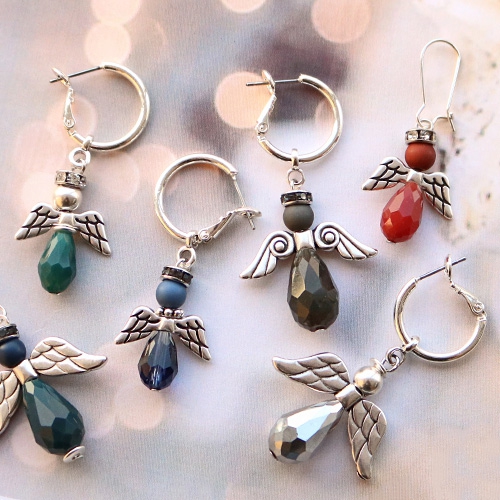 Design these special angels with top faceted drop shaped beads yourself. Combine the beads with our metal wings, round faceted beads and strass rondelle beads. Attach all these jewellery findings onto a head pin and attach them to a finding of you choice. You can, like we did, attach them to an earring, but these angels also look great on a keychain or necklace.