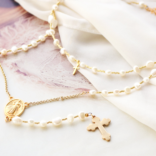 Jewellery is often a symbol for something or someone. By adding religious symbols to your jewellery you can strengthen that. To inspire you we have created a beautiful set of jewellery that proves that trendy and symbolism go well together. The gold coloured DQ European metal charms together with freshwater pearls give a fantastic effect. You can also use these parts to make a beautiful rosary necklace or bracelets with religious charms
