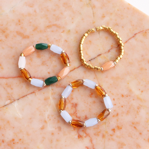 The top faceted tube beads are beads that you can use in any piece of jewellery. But this time we used them to make super cute rings. What do you need for this? These rings are made of Beadalon elastic cord 0.5mm and Beadalon Stringing Wire Supplemax 0.25mm. Cut a large piece of stringing material, about 10 cm (for one layer ring) to make it easy to knot the ring after threading. Now make a nice design with the beads. You can choose to combine the top facet tube beads with Miyuki beads. Thread the beads over the stringing material and close it with a number of knots on top of each other. To make it extra secure you can also put a drop of glue on the knot. Now it is your turn to make these fantastic rings yourself, good luck!