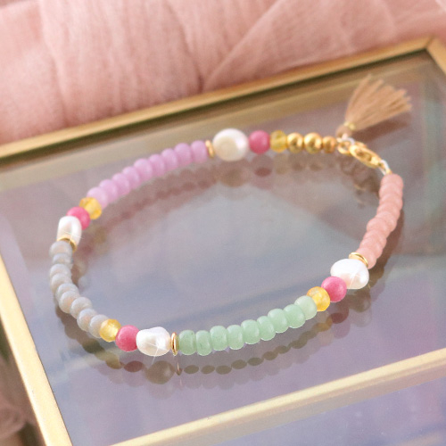 Our new collection Preciosa glass seed beads is perfectly fit as a foundation in all your jewellery projects. We have used these beautiful beads for creating a necklace with matching bracelets. Because the Preciosa beads are made of glass, we thought it was fun to combine the Preciosa beads with other natural materials. We choose to use freshwater pearls and chips stone natural stone beads. Decorate the jewellery with gold coloured details and tassels you get an amazing effect! Create matching bracelets to go with the necklace for a unique ensemble, on which you will most certainly get some fun reactions! Due to the enormous assortment Preciosa glass seed beads you can go crazy with colour combinations. Good luck!