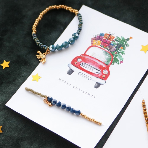 Minimalist bracelets of faceted beads with new jewellery cards in winter wonderland style