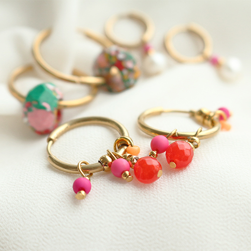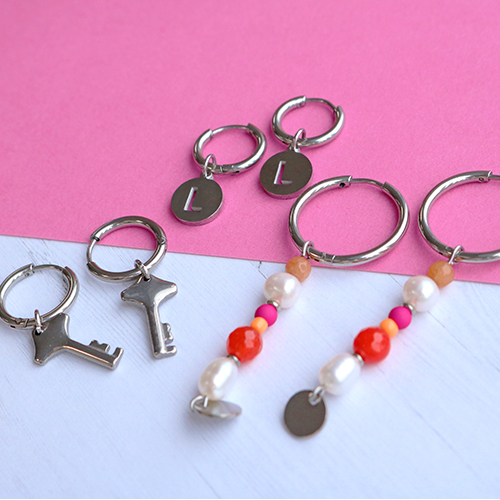 Are you looking for inspiration to make earrings for next season? In this inspiration set we made several earrings with stainless steel creoles. These creole earrings are very suitable for customized earrings. Design for example earrings by moving a beautiful imitation natural stone faceted bead across the creole. Or choose a heart shaped connector. These items are easily interchangeable and the creoles become the basis to create a different earring every day. Fix different lengths of belcher chain to a jump ring and transform your creoles into trendy jewellery! You can also alternate different beads to a headpin, make a loop by using round nose pliers so you can slide the creole through the loop. Use for instance rocailles beads in different colours and freshwater pearls for an elegant look!