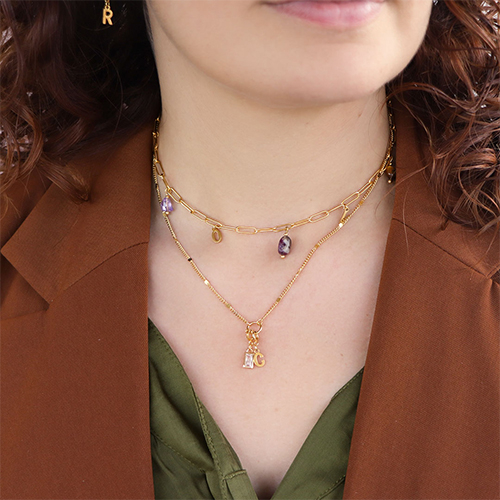 Initial charms are ideal for adding a personal touch to your jewellery. To create bracelets, use a belcher chain to which you attach charms with small carabiner clasps. In that way you can easily swap the charms. Combine the charms with a crystal glass charm or natural stones to make beautiful necklaces. To create earrings, match the pendants and combine them with a trendy ear cuff.
