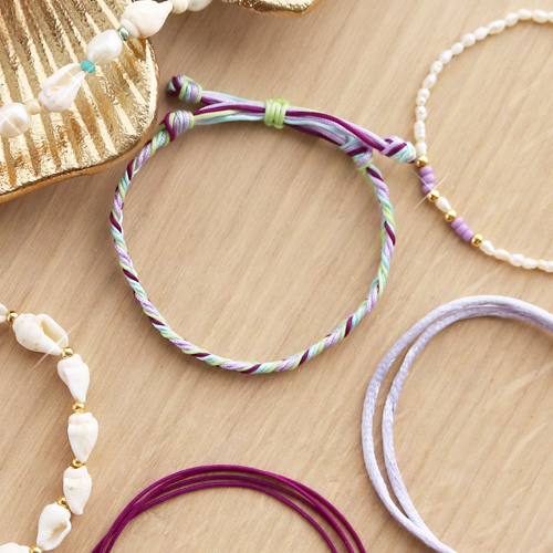 That you can make nice combinations with macramé bead cord, freshwater pearls and shell beads is no secret. But how to get started? For example, use different colours of macramé bead cord to make a nice bracelet by knotting or braiding it. Finish with a sliding knot and your summer bracelet is ready to wear! Want to add something extra? Thread seed beads or freshwater pearls on to macramé bead cord and secure the middle piece by tying a knot next to the last bead or squeeze a crimp bead flat. This way everything stays neatly in place. You can also use freshwater pearls and shell beads to make a sunglass cord. Thread the pearls and beads together with seed beads and DQ European metal beads on metal wire and close both sides with a pair of glasses cord ends.