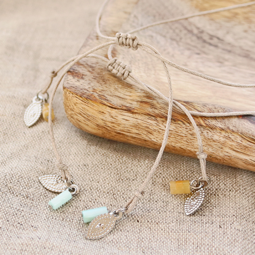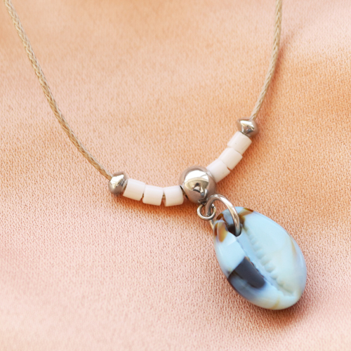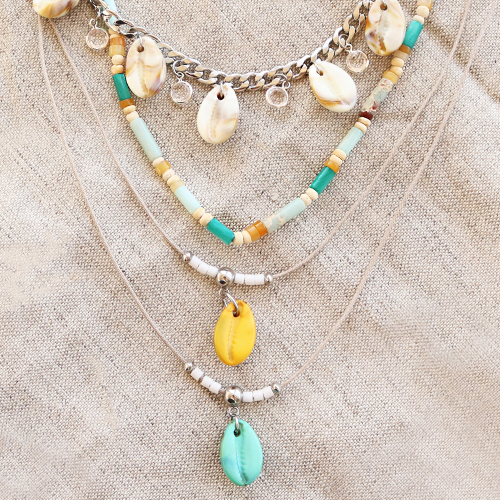 Then thread Miyuki or natural stone beads over macramé bead cord together with a resin cowrie shell and make a sliding knot at the end. At the end of the necklace you can hang a nice charm or bead. Do you want to create a complete set? Thread a necklace of natural stone beads on elastic in matching colours.