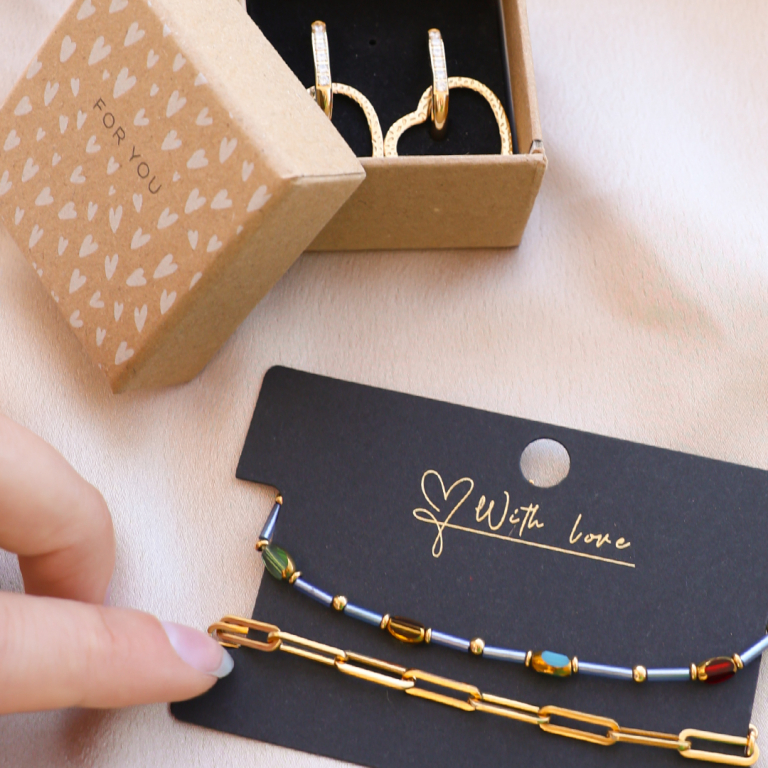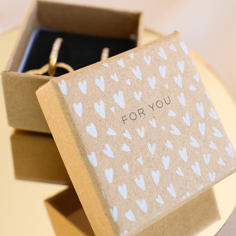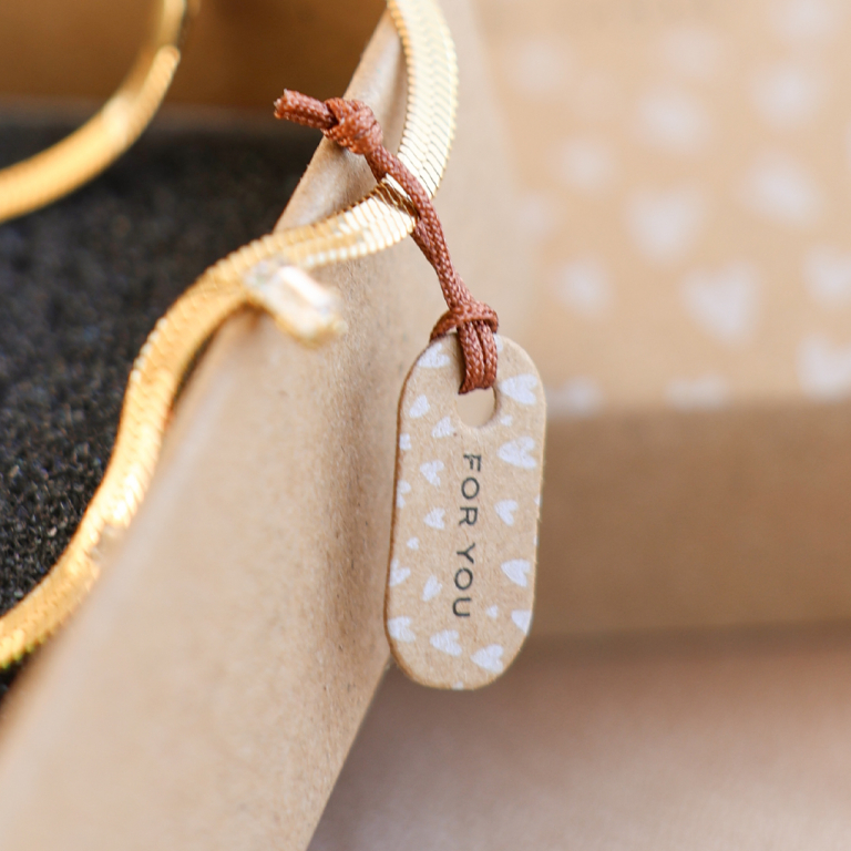 Who doesn't want to receive a beautiful piece of jewellery in a designated box with a personalized card? The boxes and cards designed by our own design team with texts like 'For you' and 'Pretty things inside' will charm your customers for sure!