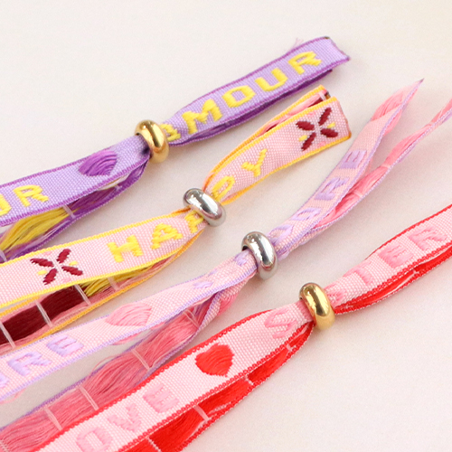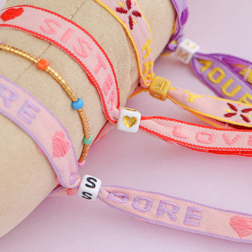 Use this beautiful ribbon with text to make bracelets you close with for instant a smart stopper bead or an acrylic letter bead with a big stringing hole. Create beautiful bracelets with various beads you can wear together with the ribbon bracelets. String colorful glass seed beads on an elastic cord or create a bracelet alternating freshwater pearls, glass seed beads, smiley beads and belcher chains.