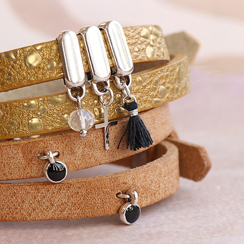 Are you looking for inspiration to design a stylish bracelet collection? Get ready to work with these Cuoio bracelets and matching sliders and cabochons. You can also choose to use a rivet from the Swarovski Elements collection. Make sure to use a soft surface when you place the rivet with your Swarovski cabochon in the bracelet to avoid damaging the stone. If you want to fix a charm or a belcher chain, make two small holes next to each other with hole punch pliers. Open a jump ring, slide it through the holes and close it again. You can fix your charm or belcher chain on the jump ring!