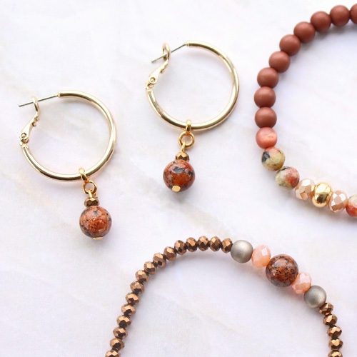 Shop our new collection sharp priced natural stone beads and create the most amazing ornaments! We’ve made different bracelets and earrings with these pretty beads and here you’ll read exactly what you need… Combine the natural stone beads with DQ European metal earrings and connectors for a surprising contrast. Also use DQ European metal beads when making the bracelets and vary the natural stone beads with acrylic beads and top faceted beads. At last you can decorate your jewellery with, for example, tassels for a playful effect. Good luck!