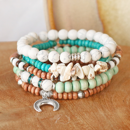 Are you looking for wooden beads inspiration? Then you have come to the right place! We started and made tough bracelets with wooden beads for both men and women. When designing men’s bracelets, it is fun to make use of different dark coloured wooden beads. Put together a bracelet with various wooden beads, DQ European metal beads and elastic cord. On the other hand, you can create a trendy women’s bracelet by threading wooden beads on the waxed cord to make a flower. Tip: apply some glue on the ending of the waxed cord, so that the beads are easy to thread. For an extra summery look, you can add some cowrie shells to the bracelet. Design different types of bracelets, by combining the wooden beads with natural stone beads, chip stones and DQ European metal charms. Get started and create beautiful jewellery with a natural look!
